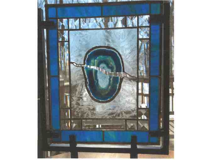 Win this original design consisting of a beautiful agate set in stained glass. Suitable for hanging or table top stand. Dimensions: 12 1/2 " H x 10 1/4 " W.