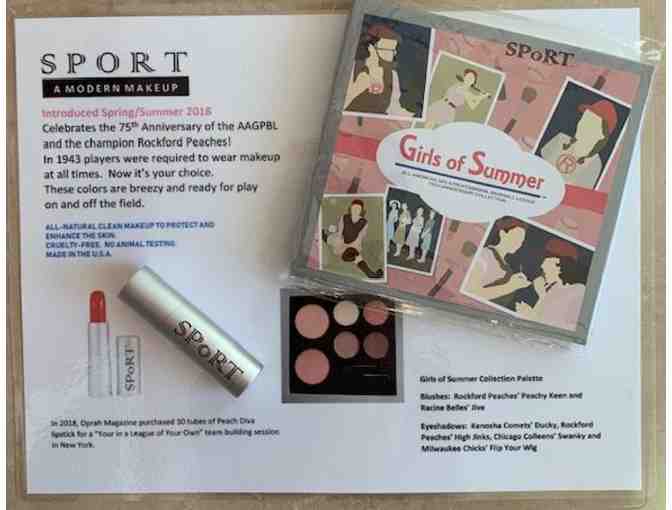 A complete palette of four eyeshadows and two blushes and the signature lipstick, Peach Diva. This is a high-end all-natural clean makeup made in the U.S.A. No animal testing. Cruelty-free.