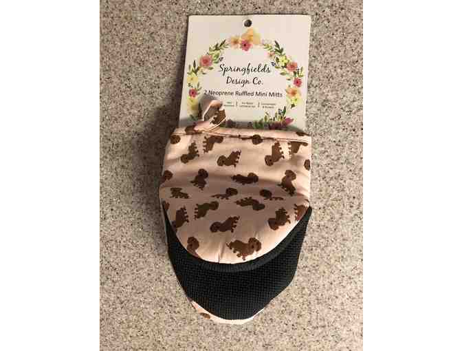 2 Neoprene Ruffled Mini Mitts with Dachshunds wearing rabbit ears