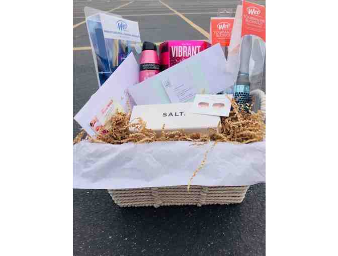 Get the gorgeous look you'll love with this ultimate style basket! Start with a fabulous haircut, style, and deep conditioning treatment by professional stylist, Stacee Mason, at local Salty Blonde Cut Co., and enjoy several amazing styling tools such as 2 round brushes, a Wet brush/flat iron set, SexyHair Shampoo/Conditioner set, and SexyHair Hairspray. Then treat yourself to a mani or pedi at Finest Nails. Last but definitely not least, top off your look with a stunning pair of Honey Gold, polarized, Pratt-style SALT sunglasses.
