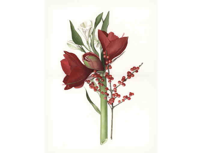 Description: Giclee print of bouquet made of amaryllis, alstromeria and winterberry and drawn in beautiful botanical painting.