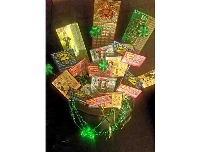 Get lucky with this Pot-O-Gold filled with Lotto scrstchers, Irish swag, and some "gargle" to get you "Full as a 9 weel keyart!" .