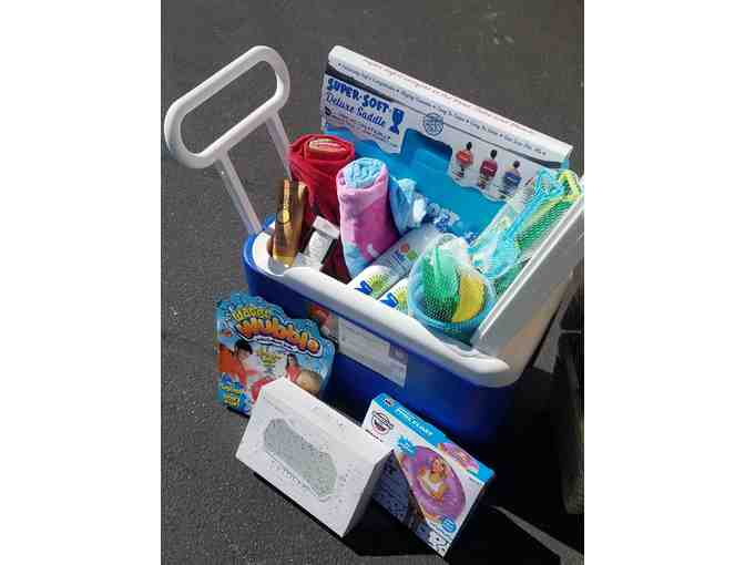 Includes: Igloo Cooler, Tech2 Extreme Splashproof bluetooth speaker, Wubble refillable water balloons, 2 beach towels, BigMouth inc. Giant Donut Pool float, 2 super soft deluxe saddle pool chairs, Beach toys, sunscreen, Rose Gold Corkcicle Stemless wine glass, Black Yeti Rambler Colster, 6 pack of Corona, 6 pack of Smirnoff Raspberry Roseā², Hawaiiann Sweet Maui Onion Chips and s'more!