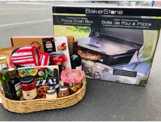 Included - BakerStone Pizza Oven. Pizza Peel/Paddle - Pizza Cutter -Good Grips Clean Wheel Pizza Cutter - Condiments (Parmesan & red pepper shakers, olive oil, balsamic, pizza/pasta spices) - Pizza crust mix - Sur Le Table - Pizza ingredients (tomato/truffle sauce, tomatoes, olives, pepperoni, garlic) - Wine - IBC Root Beer - 4-pack - Red & White Oven Mitts - “Let’s Make Pizza” book