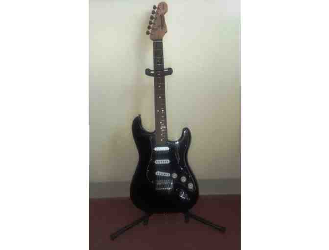 This black guitar with a maple fingerboard also comes with a guitar stand.