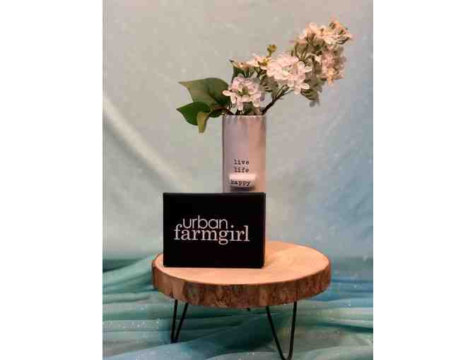 Urban Farmgirl $100 gift card & Live Life Happy Vase & Wood Pedestal