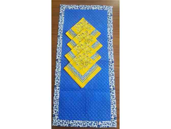 For this fundraiser she offers this cotton table runner (measuring 39" by 18") and four matching napkins.