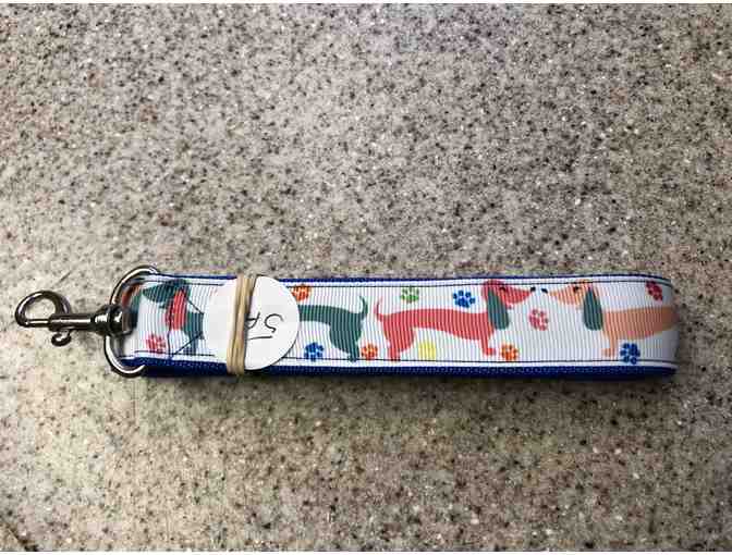 5 foot long dachshund leash (pastel doxies with different colored ears with pawprints in the background).