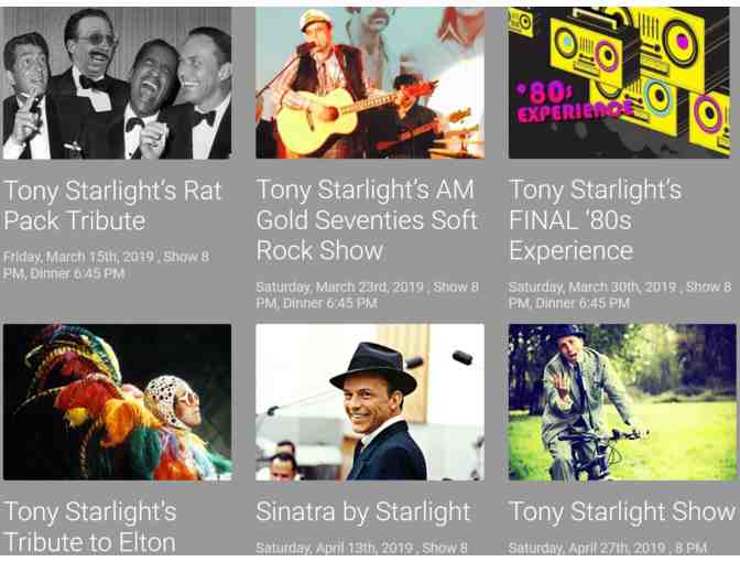 The winning bidder will enjoy this certificate for "Standard Dinner and Show for Two," up to a value of $130. Drinks and gratuities must be paid separately. Use by 4/27/2020. Not valid Friday and Saturday in September, or 12/31 or 2/14.