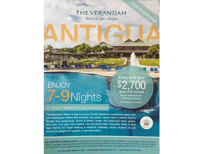 This resort Certificate provides 7 to 9 nights accommodation (double occupancy) for 3 rooms (valued up to $900 per room depending on dates of travel) at the Verandah Resort & Spa. All reservations are subject to a required supplement of $125 per person /per night which provides all dining, all beverages (including alcohol), resort facilities, activities, service charges & gratuities. Government tax is additional. Guests choosing to upgrade to a higher category may do so for as little as $40 per night + tax. Reservations are subject to availability, some restrictions apply. Air transportation is not included. Should you require air we are available to assist. Resort black-out dates do not apply however, additional peak season surcharge of $50 per person, per night applies for stays Dec. 21- Jan. 3 & Feb. 1-24. Air must be purchased at the time of booking for stays Dec. 21 - Jan. 3 & Feb. 1-24.