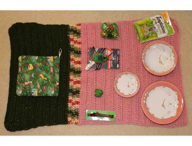 Up for auction is this Pink and Green blanket with cat accessories, which includes: