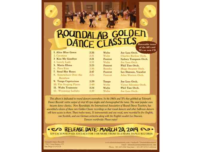 Roundalab, the International Association of Round Dance Teachers, has assembled a dozen rare Golden Classic recordings so that round dancers and other ballroom dancers will have access to them. These twelve tunes, 11 instrumental and one vocal, were recorded by five English, one Scottish, and one German orchestra along with the English vocalist, Les Dawson. Dancers worldwide: Please enjoy!