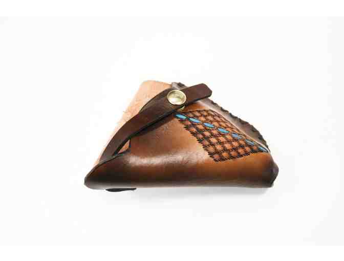 Smooth brown leather gun holster. Decorative black and blue pattern, gold button and hand stitching. Slides onto a belt. Not reversible.