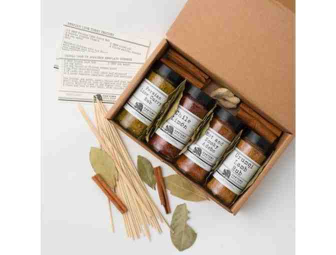 The griller of exotic flavors will relish this collection of seasonings with 1/2 cup jars of Persian Lime Curry Rub, Chile Limon, Hot and Smoky Adobo, and Urumqi Lamb Rub. Each box is packed with bay leaves, bamboo skewers, ginger root and chiles.