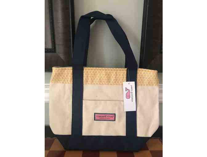 Vineyard Vines classic mini tote bag, yellow silk trim with pink starfish print. 100% cotton canvas body, 100% silk trim, 100% cotton lining. Zip top closure, water resistant bottom, 4 interior pockets, double canvas handles, Vineyard Vines label on exterior.
