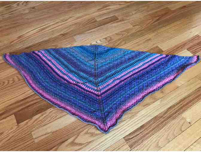 Handmade shawl using thin yarn. Measures approx. 45" accross longest edge.