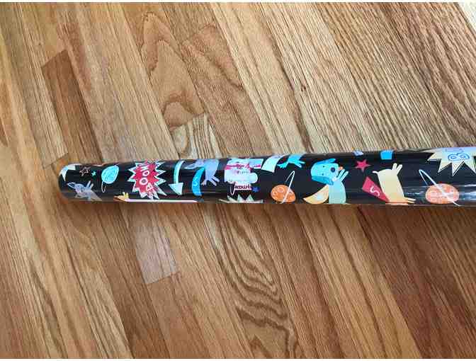 Dog-themed wrapping paper, dachshunds and other dogs printed.