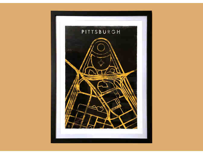 Bring a piece of Pittsburgh into your home with this stylized art print. Features a transit-style map of downtown Pittsburgh and the Point. 18 by 24 custom-framed giclee art print. Ready to hang.