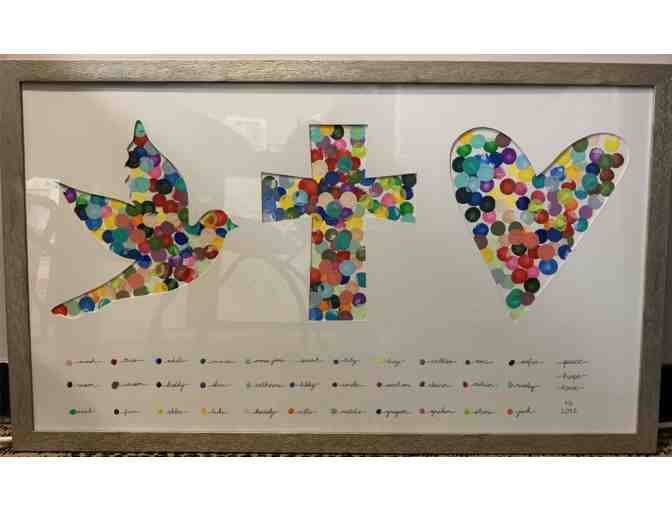 This beautiful piece of art was created by the Pre-K class. The symbols represent Peace, Hope and Love. Each student has their own distinct color, displayed on the bottom of the art. It also includes on the bottom, "Class of 2032". The students made their mark on each of the three symbols to resemble those characteristics in their own lives. The frame is approximately 30"W x 20"L.