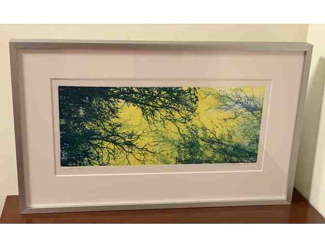 This framed piece is one-of-a-kind, hand-printed using oil etching inks in yellows and greens on heavy weight printmaking paper by artist Lonnie Harvey. Dimensions: 20 inches x 12.75 inches. Located at the Umbrella Community Arts Center in Concord, MA, Lonnie has been creating monoprints, described as "painterly prints," for over twenty-five years. This is a unique process that combines painting and printmaking, using a "plate" (usually plexiglass) as a canvas, and with a variety of inks using rollers and paintbrushes. Lonnie's monoprints contain scenes painted from nature, inspired by the places she has visited. No two are alike.