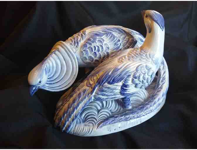 Stunning blue and white figurine of two pheasants. Made in Italy. In excellent condition.