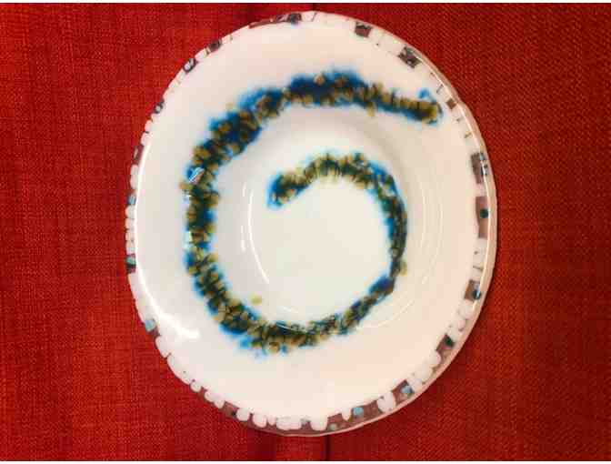 Beautiful 81/2" circular white fused glass bowl. This one of a kind bowl also has turquoise and brown accents.