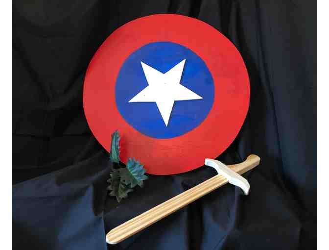 Hand-crafted wooden toy 18" shield and 17" sword inspires the child's imagination to be a mighty super-hero.