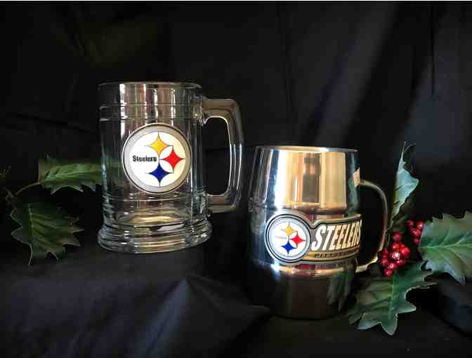 Drink up! Set of two Steelers mugs for your game-day celebration.