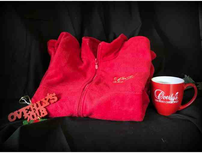 Overly's Country Christmas® Red Ultraclub Iceberg Fleece Full-Zip Jacket, size medium.  100% polyester, pill-resistant, elastice cuffs, extra-roomy, nylon-reinforced zippered pockets, front zipped. (Size runs one size bigger than you may normally wear).  Wear over a turtle neck or as a jacket coverup on a chilly fall night.