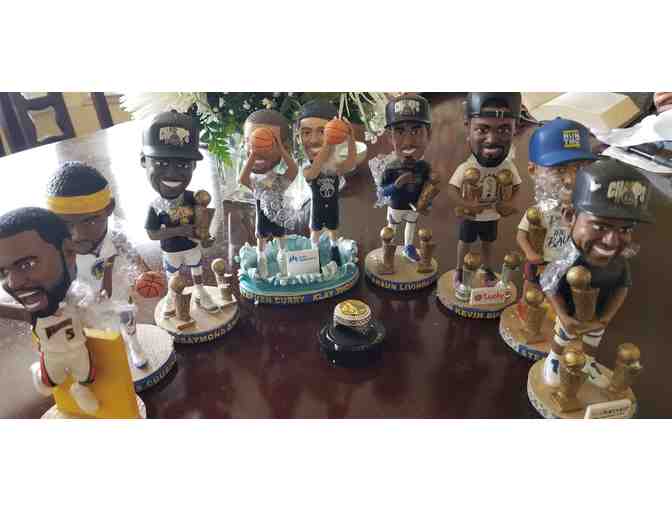 Warriors 2017/2018 Bobblehead collection and replica champion ring, Draymond Green, Kevin Durant, Stephen Curry, Shaun Livingston, Baron Davis, Demarcus Cousins, Stephan Curry and Klay Thompson, Andre Iguodala