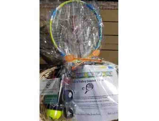 two 60 minute group tennis lessonfor adult or junior (ages 8 to 18), junior racquet, can of balls, junior sunglasses, water bottles, tennis tattoos, net generation drawstring bag, tennis hat