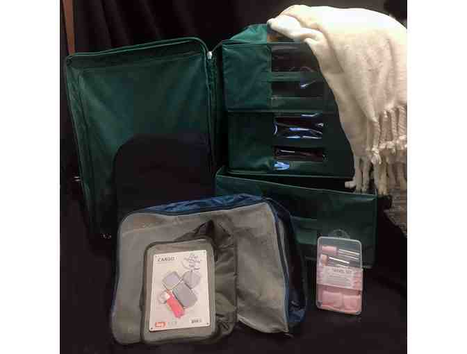 JOY Lightweight TuffTech™ Luggage Dresser with SpinBall™ Wheels, 3 removable clear-view fold flat drawers with snap-in shelving; use as mobile dresser or traditional suitcase. Set of suitcase organizers and tote.