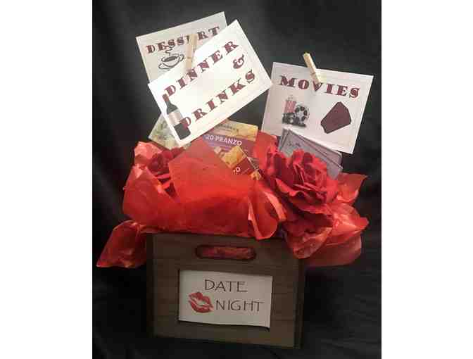 Dinner and a Movie! $40 Carrabba's Gift Card, $20 La Madeleine Gift Card, Four Showbiz Cinema Tickets, Jar of Candy, Chalkboard Crate & 4 Silk Roses.