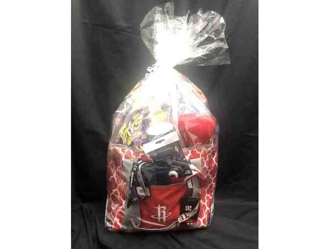 Red Rockets Cooler Bag filled with: red Rockets hat, black World Series Astros hat, Houston Texans rain poncho, Houston Texans insulated cup, Houston Texans badge reel, Dallas Cowboys and Texas A&M lanyards, University of Houston visors, Rockets basketball, footballs, drawstring bags, backpack, koozie and T-shirts