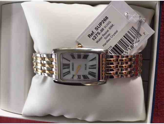 Seiko SUP268 Solar Core women's watch features a 23mm wide and 7mm thick solid stainless steel case with a fixed bezel and textured push-pull crown. Seiko SUP268 is powered by light energy with an accurate Japanese V115 solar quartz movement. This beautiful watch also features a sharp looking milky white dial with gold tone luminous hands and Roman numeral hour markers along with the 12-month power reserve once fully charged function, scratch resistant hardlex crystal and water resistant to 30 meters. Seiko SUP268 is equipped with a 15mm wide two tone yellow gold plated solid stainless steel bracelet with a fold over push button clasp. Seiko SUP268 women's Solar Core quartz white dial two tone steel bracelet watch is brand new and comes in an original Seiko gift box and is backed by a 3 years for USA and 1 year international limited warranty.
