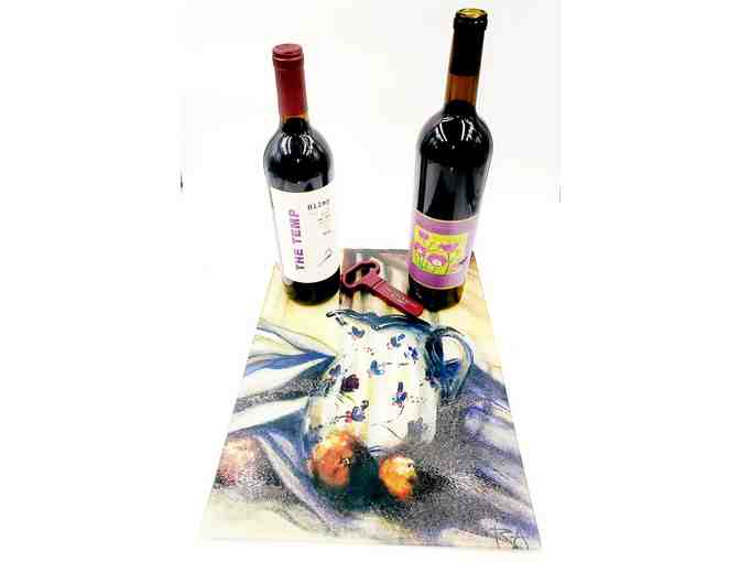 This package includes Hill Country wines from Texas, with a glass cutting board and art painting by Rebecca Aguilar.