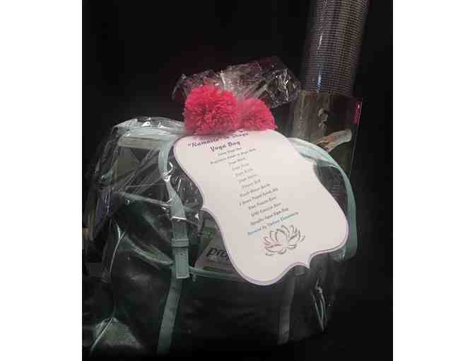 Lotus Yoga Mat, Beginners Guide to Yoga DVD, Yoga Block, Yoga Strap, Yoga Socks & Gloves, Fitness Ball and more in a Metallic Gym Bag.