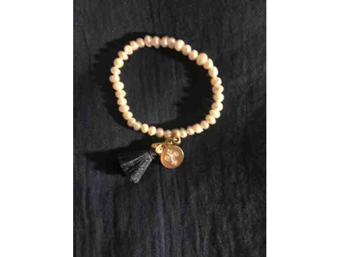 Fresh Water Pearl Bracelet with a gold fill charm medal with Armenian cross in Swarovski and silk tassel.
