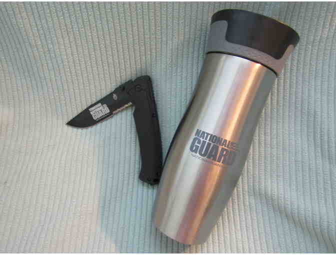 Gerber Folding Decree Knife with TN National Guard labeled on blade and Stainless Steel Coffee Mug with TN National Guard label