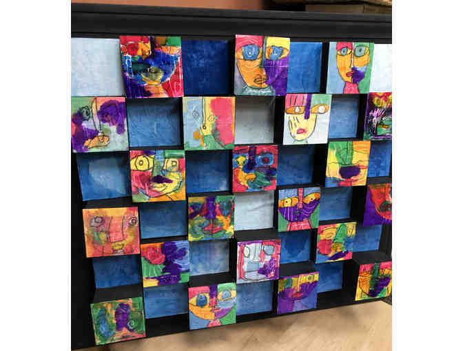 Ms. Terriann and Ms. Necia's class art. We recently completed an art unit study on Pablo Picasso. The children enjoyed learning about his blue and rose periods and have been doing their own self-portraits. They have also been creating their own Picasso-inspired face paintings. They did such a nice job on the abstract faces that we were inspired to create this project. Each student has a blue square and an abstract face. They first drew the face, then added crayon accents, and finally finished with watercolor. Then, they painted two black blocks on which to mount their Picasso-inspired art squares.