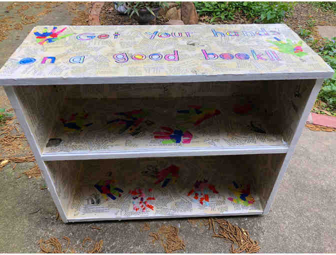 Our Reader's Corner Bookshelf will help you Get Your Hands on a Good Book! The shelf is decoupaged with book pages, and it features sweet hand prints created by every child in the class. We chose to do a bookshelf because it is a practical piece for storing your child's favorite books, and we know how hard our class has been working on reading and writing this year.