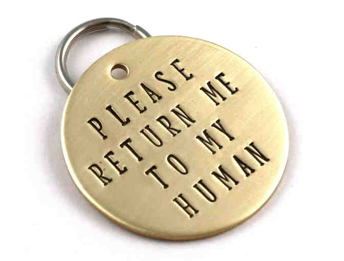 Winning bidder chooses a customized fun and unique dog or cat tag. Featured in Modern Dog Magazine. Personalized pet tags are all hand stamped and engraved.