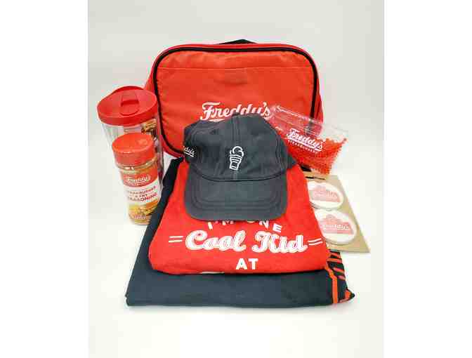 Enjoy this Freddy's gift bag featuring t-shirts, a hat, a cup, and a meal for four!