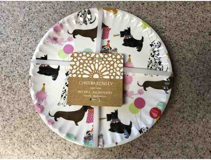 Set of 6 Cynthia Rowley Salad Plates featuring dogs with balloons wearing party hats
