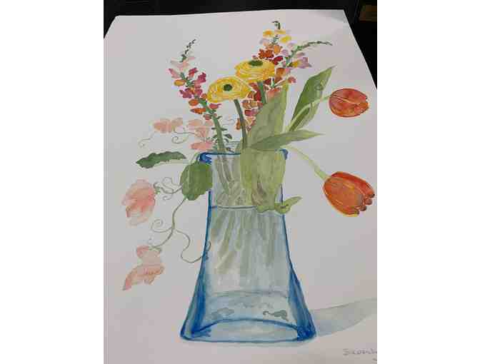 A Framed (24"x18") Water Color Painting On Paper, titled "Spring Bouquet In Blue Vase" by Beverly Orthwein. This painting is valued at $1500.