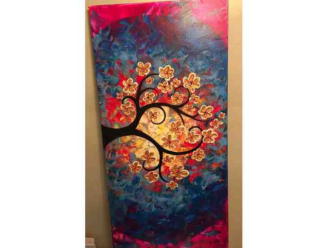 Bold, bright colors create an atmosphere of fun with this 28"x48" wall mount artwork of blossoming trees.