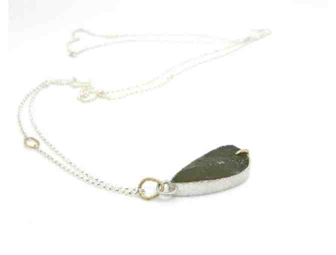 This handcrafted piece is created by Hannah Blount Jewelry, of Boston. The Teardrop Vanity Pendant is hand crafted with a 13.83ct Beryl gemstone, and is greenish-blue in color, with bright silver. The 32" infinity chain is bright silver, with a 14k gold accent.