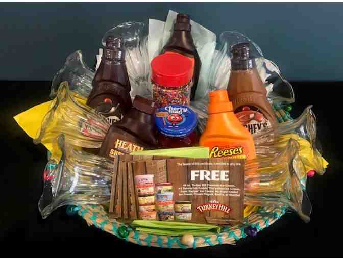 Satisfy your sweet tooth with this yummy basket! Includes 8 Footed Sundae Glasses, assorted toppings and Certificates for 4 - 48oz Turkey Hill Ice Cream.