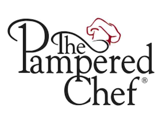 Basket of cooking goods, featuring various kitchen tools and a recipe book. This basket includes; Italian Seasoning Mix, Pizza Cutter, Chef's Tongs, Mix 'N Scraper, Coated Utility Knife, Pineapple Wedger, Spiral and Slice, Classic Scraper, Fluted Cake Pan, Kid's Cookie Baking Set, Large Round Pizza Stone, Prep Bowl Set, Measuring Cup Set, Classic Batter Bowl, Rockcrok Slow Cooker Stand, Rockcrok Dutch Oven, and a Mix 'N Chop.