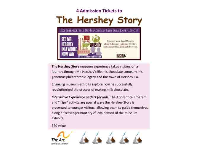 4 Admission tickets to The Hershey Story- The Museum on Chocolate Avenue.